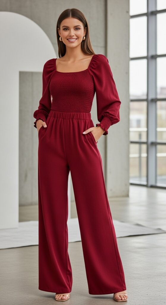 Step into sophisticated style with this striking emerald green jumpsuit, designed to seamlessly combine comfort with polished elegance. The flattering V-neckline is accented by a row of classic button details, leading down to a beautifully textured smocked waistline that naturally defines the silhouette. Flowing gracefully into full-length, comfortable wide-leg trousers, this piece offers beautiful movement and a remarkably tailored fit. Delicate long sleeves with subtle gathered cuffs complete the look, adding a touch of softness to the structured design. Whether you are stepping into a formal office setting, attending an intimate evening dinner, or arriving as a chic wedding guest, this versatile one-piece provides an effortlessly put-together ensemble.