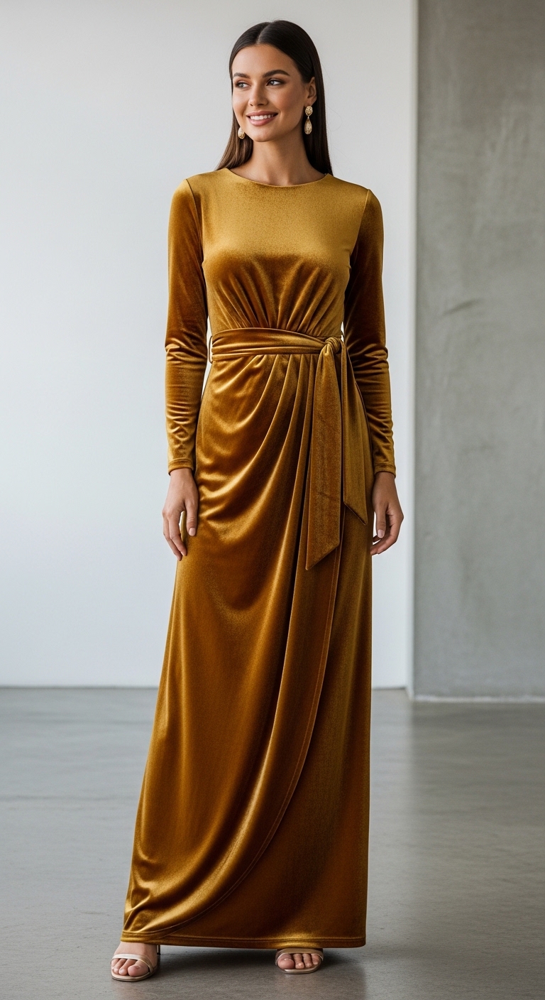 Radiate polished elegance in this striking velvet maxi dress that beautifully captures the light with every movement. The design features a modest round neckline and sleek long sleeves, offering a refined and graceful upper silhouette. At the center, a flattering tie-waist detail creates gorgeous structural draping that gently hugs the figure before flowing down to a sweeping, floor-length hem. This opulent fabric and timeless cut combine to form a truly memorable piece for sophisticated formal occasions.